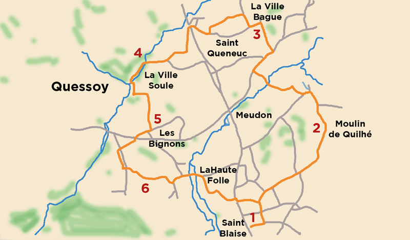 1. Entre Yffiniac et Moncontour, sur la D 765, le hameau St-Blaise offre quelques places de parking. Contourner la chapelle (XIXe) et s’enfoncer dans le chemin creux à gauche, puis à droite à la bifurcation. Après 2 km, on longe le moulin de Quilhé (privé)