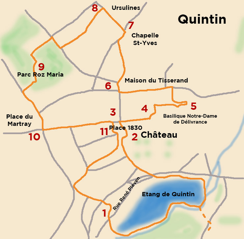 3 km (ou 4). 1 h 30 à 3 h selon le temps consacré aux étapes. Facile. Balisage : suivre le « Bonhomme Quintin », la mascotte de la ville symbolisée par une tête à cornes. Sans balisage entre les points 11, 1 et 2.