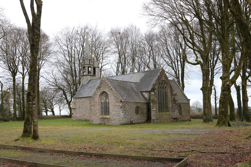4. Ceux-ci, puis une route, vous mènent à la chapelle St-Fiacre qui possède deux particularités très intéressantes : la première est d’avoir une cheminée, ce qui est extrêmement rare pour une chapelle, et la seconde est une pierre extérieure qui représente une vouivre (ou la fée Morgane, c’est selon). Poursuivez vers Ar Palez et Ty Nevez.