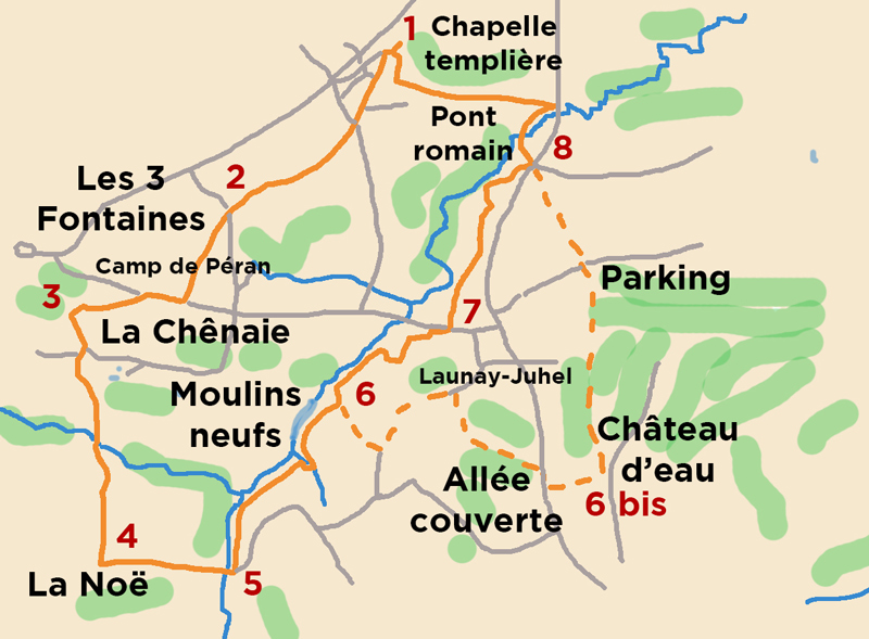 6. Au chemin des Moulins neufs, on peut opter pour un « rallongi » (non balisé) : prendre à droite, puis à gauche, à Launay-Juhel prendre le sentier à droite qui ramène vers la D 27 (allée couverte écroulée indiquée), traverser presque en face (barrière marron) et entrer dans le bois de Plédran, tourner au château d’eau (6bis) et remonter le sentier jusqu’au point 8. Ou bien continuer à suivre l’Urne et le sentier balisé. Après la passerelle, suivre la route sur l’accotement