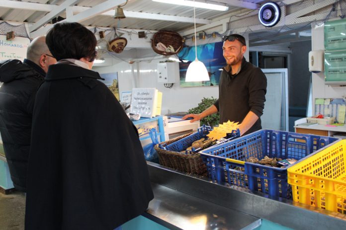 Julien Guignard se dit avant tout ostréiculteur, mais son étal nous l’avait déjà susurré : huîtres plates, creuses y foisonnent, plantureuses, débordant d’une santé insolente. Elles ont poussé, au moins trois ans, au large de port Saint-Sauveur dans des eaux de qualité maximale. A emporter ou à goûter sur place dans l’espace dégustation avec un bon verre de vin. Mis en appétit, pourquoi ne pas agrémenter le tout de praires, palourdes, bulots, élevés dans l’anse du Toëno voisine ?