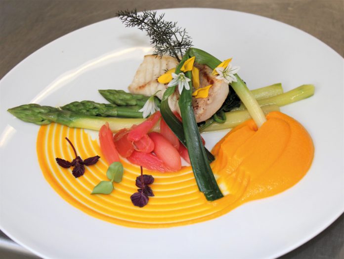 Turbot Poêlé aux asperges vertes et mousseline de carottes/sauce coquillages