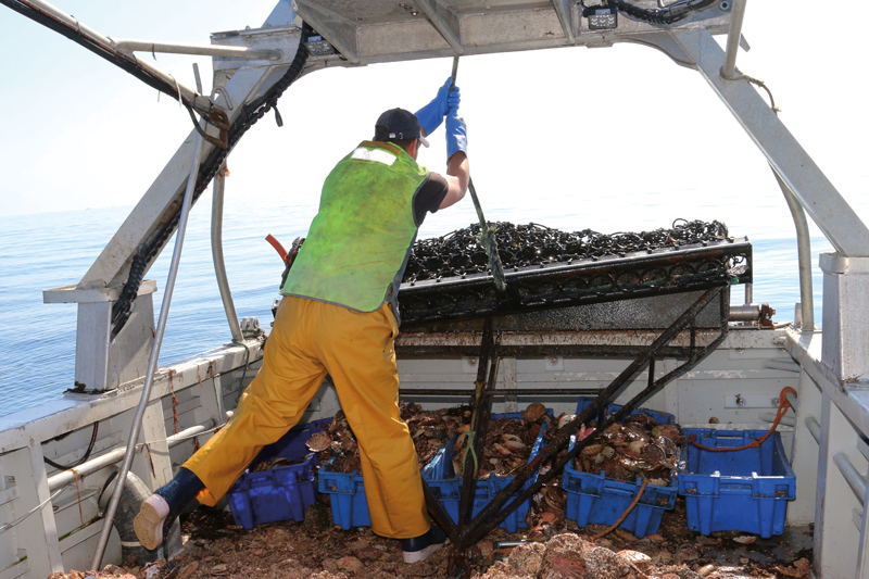 Sur son bateau de moins de 10 mètres, il sort régulièrement « draguer ». Lors des 45 minutes de pêche autorisées sur le gisement de la baie de Saint-Brieuc, deux fois par semaine en saison (4 heures pour le gisement secondaire en début de saison), sa drague plonge puis remonte 5 à 6 fois. Il n’arrête pas une minute. Pilotage, gestion de la drague, va et vient incessant de l’un à l’autre. Ce n’est pas le moment d’avoir les deux pieds dans le même sabot.