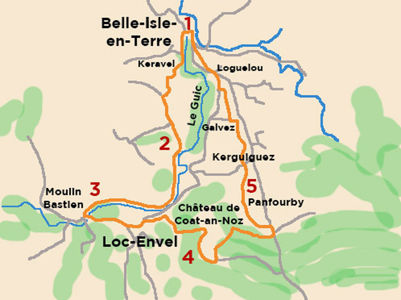 1. Départ de ce beau circuit (n°1), destiné aux vététistes et aux randonneurs pédestres, à l’aire de camping-car de Belle-Isle-enTerre située derrière le château de Lady Mond.