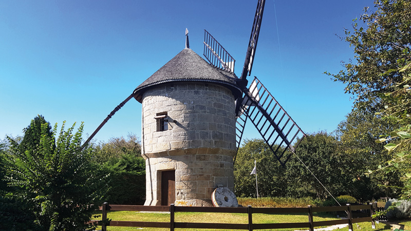 - Au moulin de Kerninon (C), traverser et remonter à gauche. Une fourche permet de rentrer directement à droite, ou de poursuivre à gauche. Avant la route une sente à droite mène au moulin à vent de Crec’h Olen (photo).