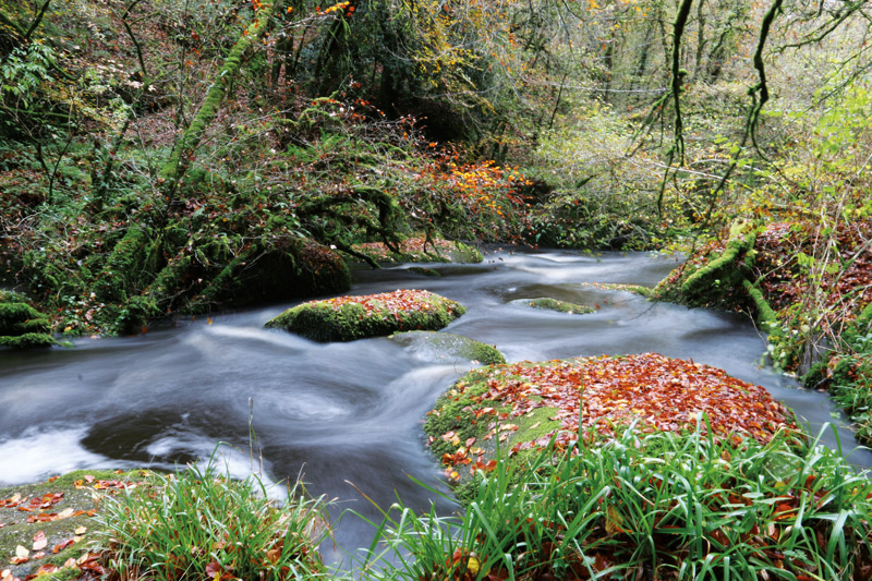 2. Une fois garé, vous descendez vers le pont, puis, juste avant ce dernier, prenez le chemin à droite. Commence alors une très agréable balade à travers bois, sur des sentiers bordés de fougères, de mousses, de frênes et d’aulnes. Vous entendez également le doux frou-frou de la rivière (Le Blavet) toute proche.