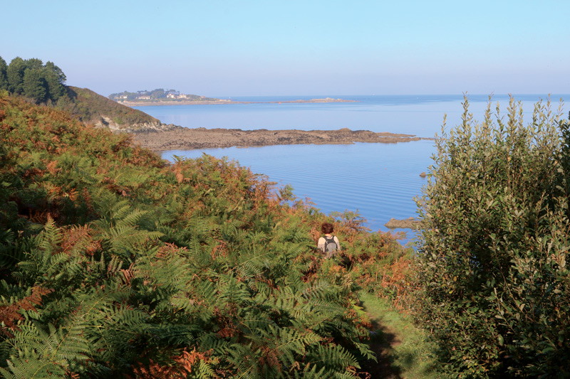 2. Vous avez une très belle vue sur la plage des Grèves (promis, on ne vous parlera pas des algues vertes qui ont pratiquement disparu à cette époque de l’année). Vous remontez par la gauche. Ça grimpe un peu. De jolis points de vue se dégagent alors à travers les branchages, notamment sur le port de Beg Douar et, au loin, sur Trébeurden.