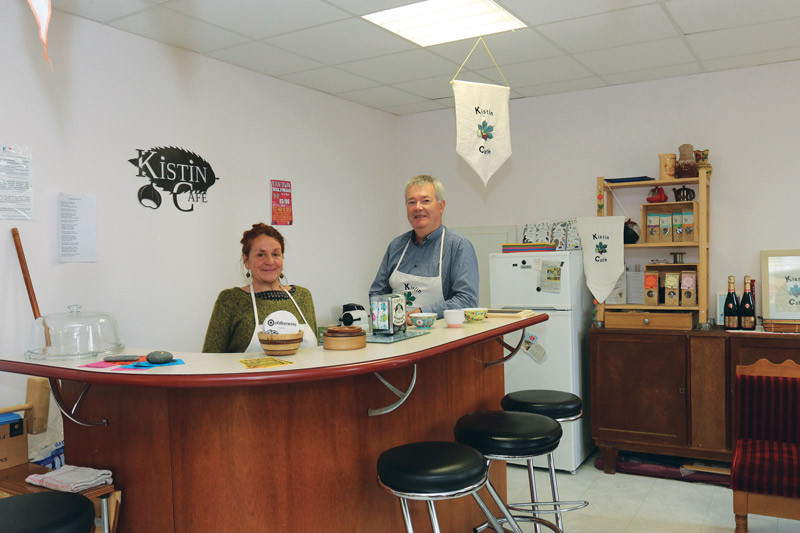 *Kistin est le nom de la châtaigne en breton. Le bar est ainsi appelé en référence au bois qui se situe en plein bourg. Celui-ci est en effet composé de plus de quarante châtaigniers et d’un seul hêtre qui doit parfois se sentir bien seul. Par ailleurs, l’association compte aujourd’hui près de 210 adhérents dont un noyau dur d’une dizaine de personnes ici représenté par Anne Amor et Alain Lamandé.