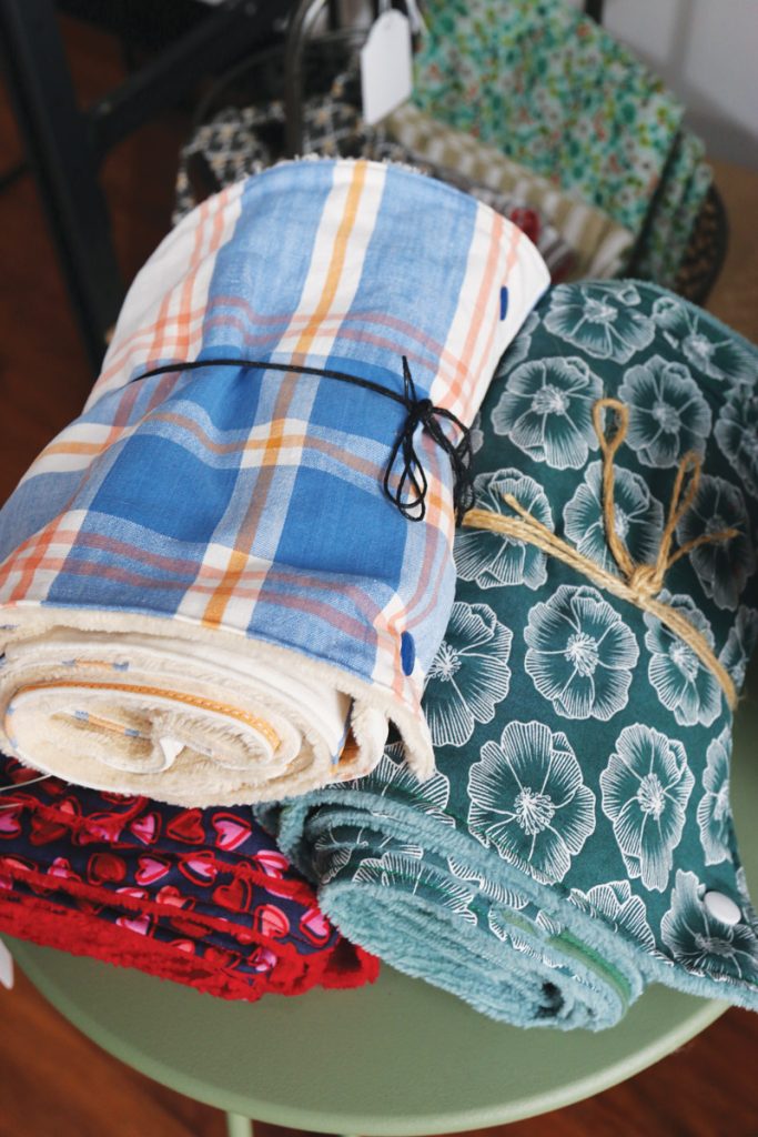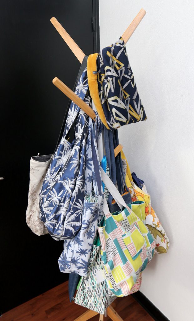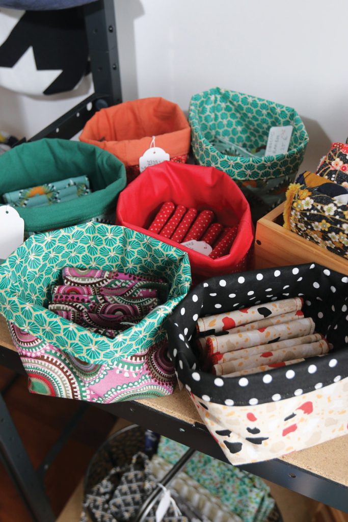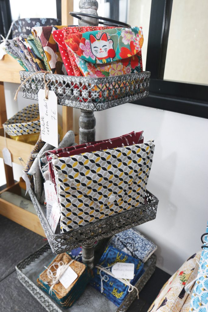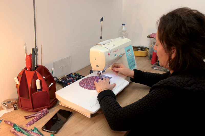 Ainsi, naissent de ses mains habiles, avec l’indispensable complicité de sa Singer Experience 400, de grands foulards réversibles, « mon produit phare », des tabliers, des calots, des lingettes lavables, des sacs cabas… Sa production porte une indéniable touche personnelle, plutôt colorée, plutôt joyeuse.