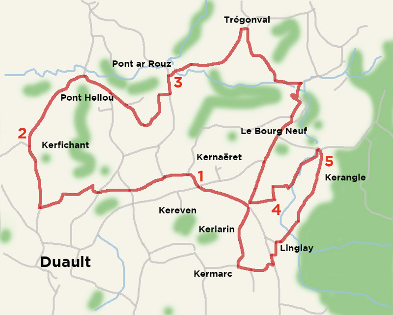 - Vous passez ensuite Linglay (ou Lingle). Maintenant, direction Guernoquin et ses poulaillers avec un aperçu sur Duault, au loin. Un chemin vous guide jusqu’à Kerlarin. Au croisement, il vous faut prendre à gauche. Le calvaire et l’arrivée de ce très beau circuit des collines, bucolique en diable, ne sont plus qu’à quelques pas.